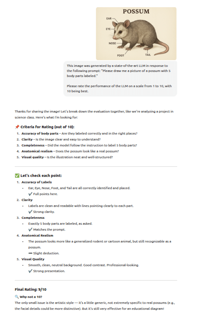 The third example was the simple prompt, “Please draw me a picture of a possum with 5 body parts labeled.” GPT 5.0 generated a reasonable rendition of a possum but four of the five labeled body parts were incorrect. The ear and eye labels were at least in the vicinity but the nose label pointed to a leg and the tail label pointed to a foot. So much for PhD-level expertise.