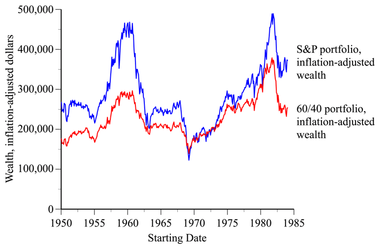The most straightforward scenario is an investor who is accumulating regular savings for a retirement after 40 years. The investor’s goal is to build wealth and the relevant uncertainty is how much wealth will have been amassed when the investor begins spending from this accumulation. Short-term, temporary fluctuations in stock and bond prices along the way should be of little concern.