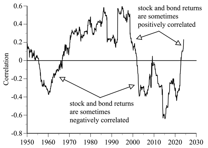The figure shows the rolling 5-year correlations since 1950 between monthly S&P 500 and 10-year Treasury bond returns. There have been long historical periods when stock and bond returns were positively correlated and other periods when they were negatively correlated. An investor who chose a stock‒bond mix in the mid-1969s, expecting the correlation to be negative — as it had been for nearly a decade — would have been disappointed by the positive correlation over the next several decades. Ditto a late-1990s investor who chose a stock‒bond mix expecting the lengthy positive correlation to continue: