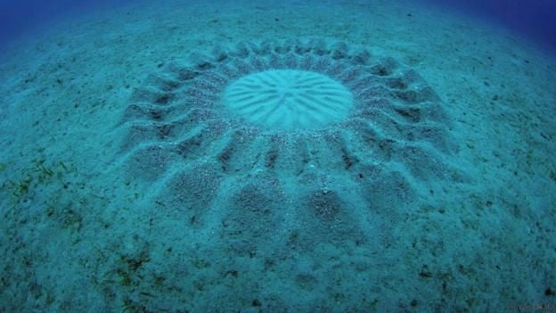 And let’s give a hat tip to the little Japanese puffer fish, who works 24-hours a day for an entire week in a row, creating a visual, sand-art masterpiece below the sea, in order to attract a female fish to mate with. It looks like this below:
